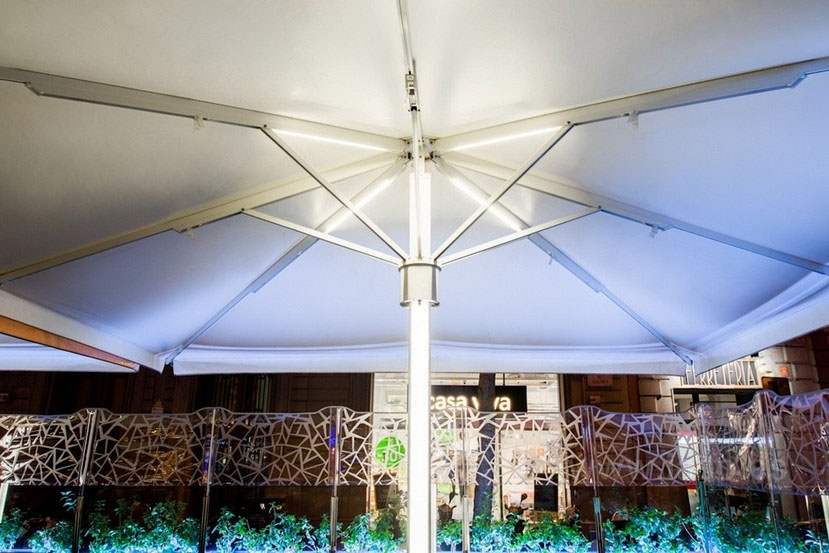 Most of the structures that the Genie’s supply partners produce, have the option of installing either strip-lights, or mini spotlights in the canvass support tubes of the retractable canvass roofs, or blades in the case of the bioclimatic pergolas. These lights are usually dimmable, and controlled via a remote or even with your smart phone or tablet. Some systems can also be fully integrated to be operated from your home automation system.